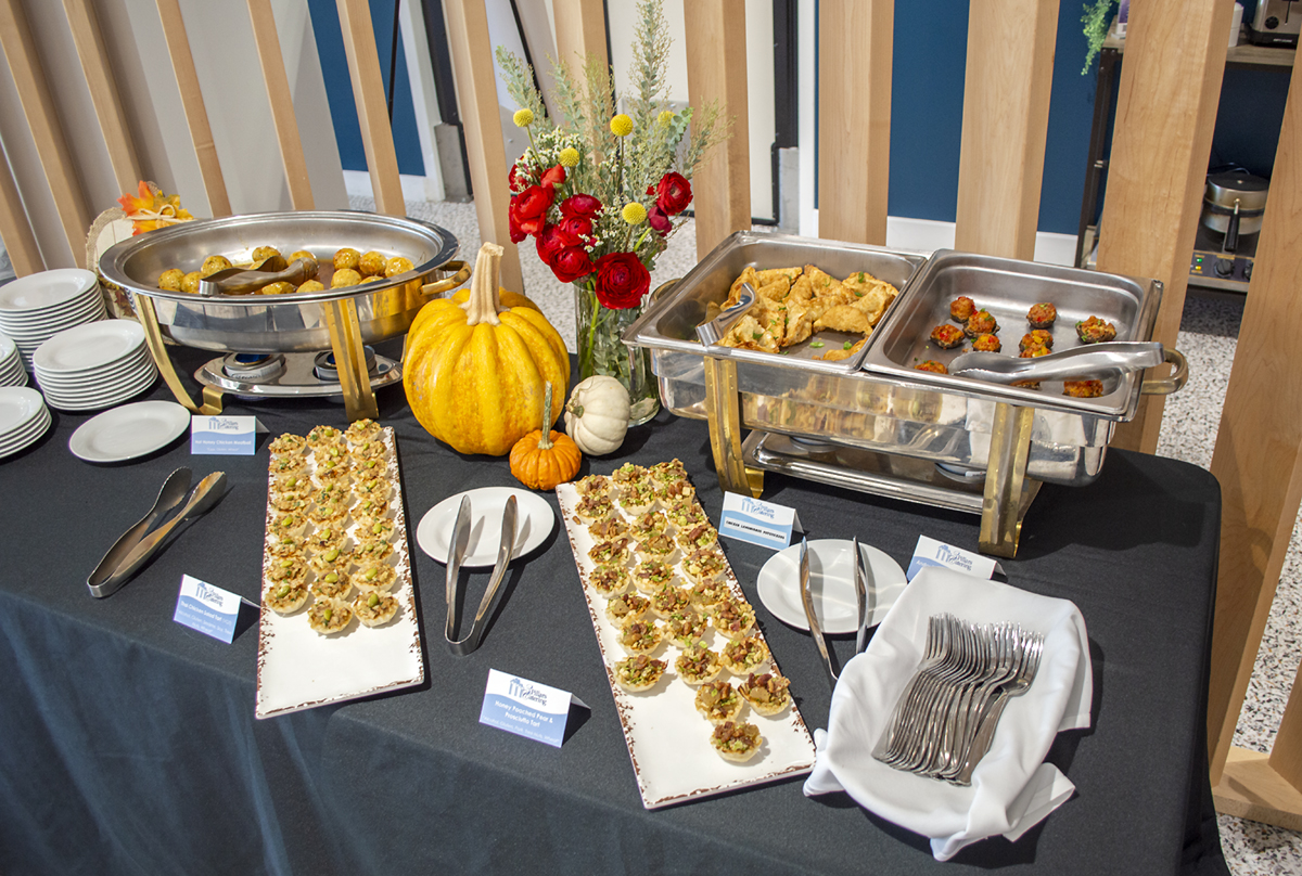 Table decorated for autumn with pumpkins and flowers. Hot Honey Chicken Meatballs, two types of phyllo cup tarts, lemongrass chicken potstickers, and stuffed mushrooms are on display ready to be served.