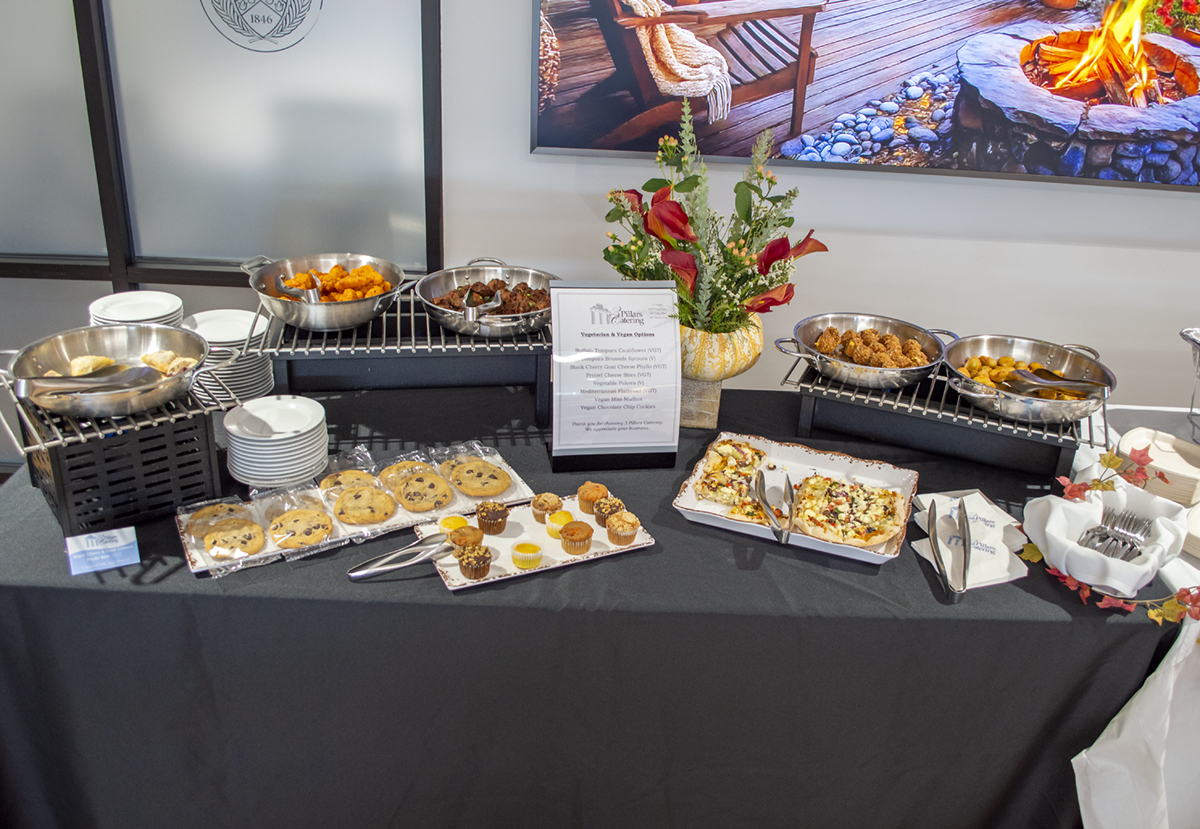 A vegetarian and vegan option table decorated for autumn with flowers and fall leaves. An assortment of different food items including chocolate chip cookies, mini muffins, tempura bites, and flatbread are on display ready for serving.